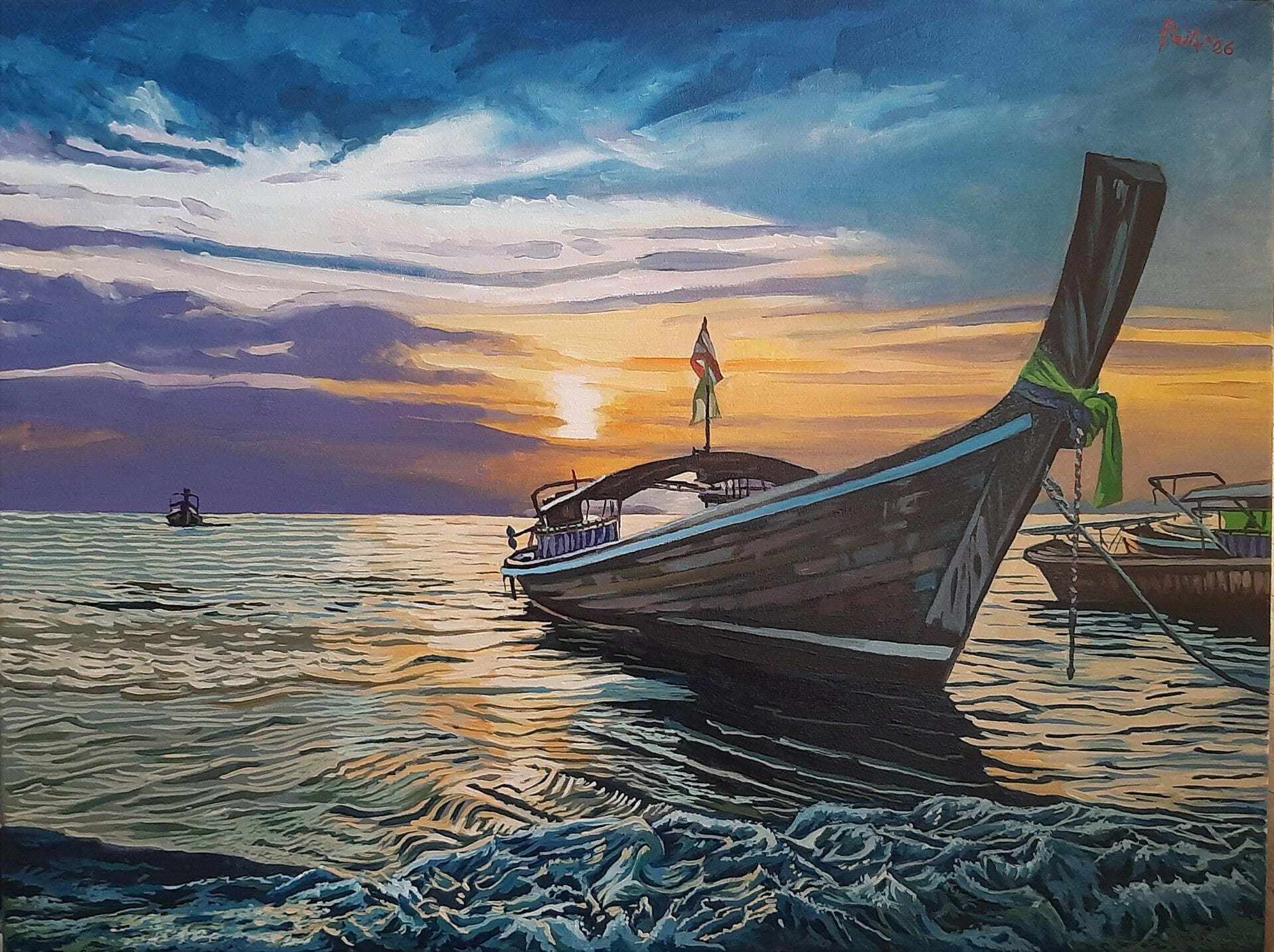 Este cuadro captura la serena belleza de las barcazas al anochecer. La atmósfera tranquila y los colores tenues del crepúsculo se reflejan en el agua, creando una escena de paz y contemplación. Las luces de las barcazas comienzan a brillar suavemente, añadiendo un toque mágico a la oscuridad que se aproxima.