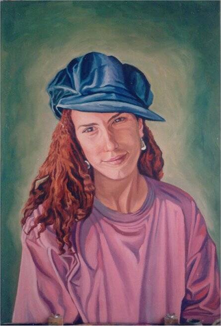 Fue el primer retrato que le hice a mi hija la mayor. Con su abundante pelo rizado y vestida informalmente. Coronando su cabeza por un sombrero – que tanto le gustan – azul.