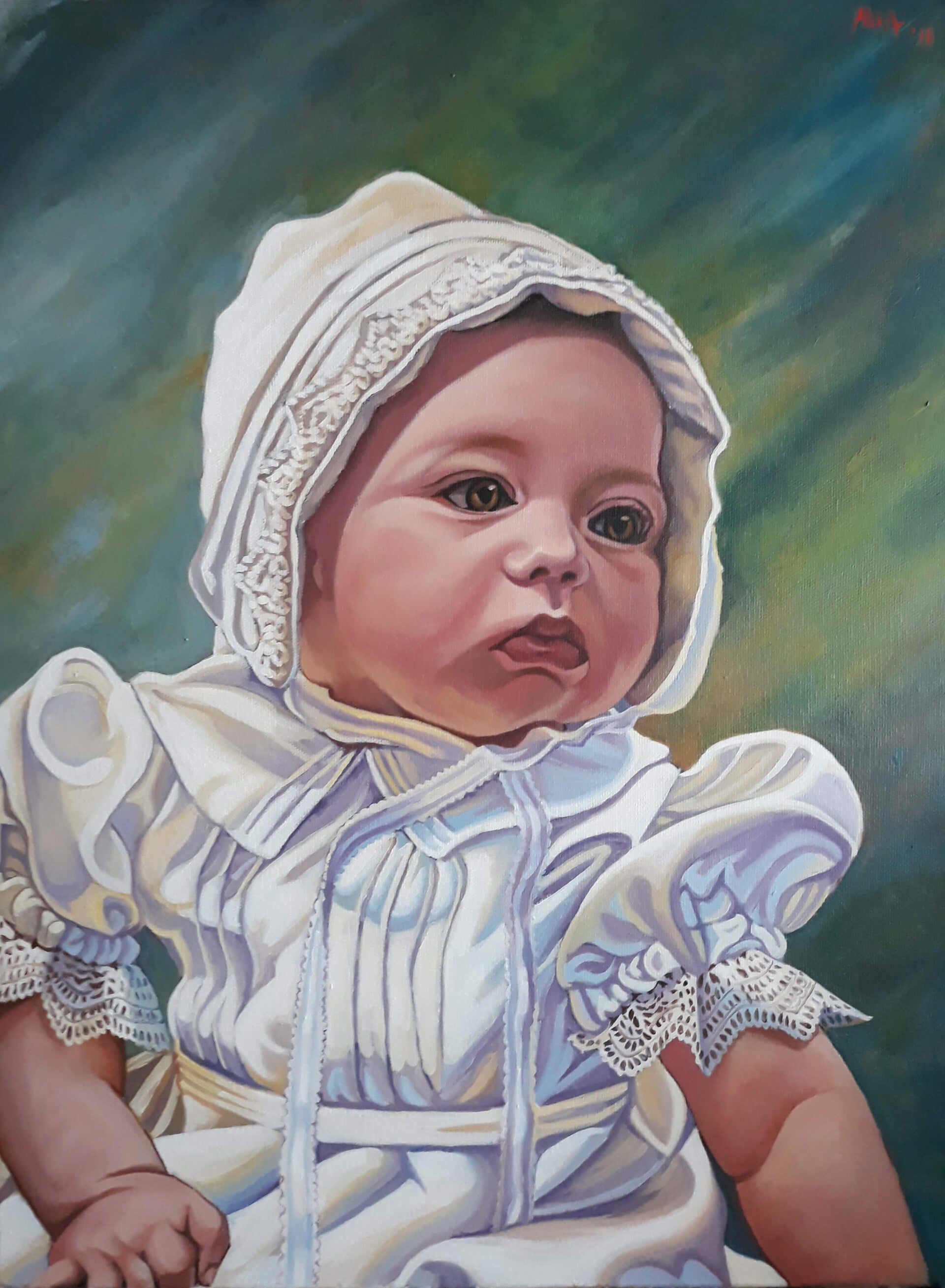 Todo ello, resalta sobre el fondo blanco de su traje de Bautismo.